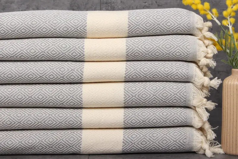 The Turkish towels are characterized by their %100 organic Turkish cotton fiber composition, ensuring superior absorbency and softness. Each towel weighs 115 grams and measures 20x36 inches (50x90 centimeters), with a hand-weaving tolerance of 1-2.5 cm.