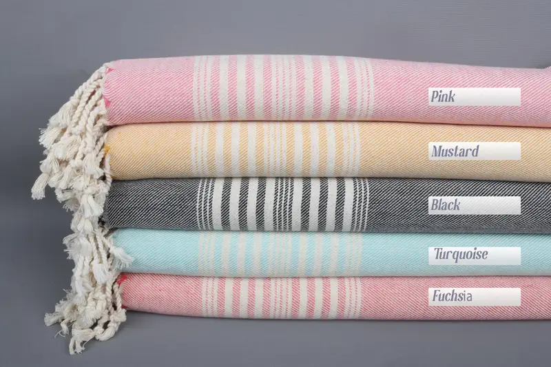 The towels are woven from organic Turkish cotton on looms, resulting in a handmade product. Ensuring fiber composition and absorbency, the towels should be washed before first use. They will become softer with each wash. Resulting in dimensions of 70x40 inches or 100x180 centimeters, the towels weigh approximately 300 grams. Tolerances due to weaving are ±2 inches or 5 centimeters.