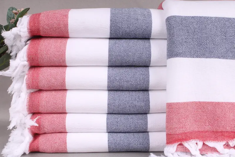 The towels are composed of organic Turkish cotton, ensuring softness and high absorbency. Characterized by dimensions of 36x63 inches or 90x160 centimeters and a weight of 400 grams, each towel allows for a ± 2-inch or 5-centimeter tolerance due to hand-weaving. Hand-weaving ensures that no two towels are identical.