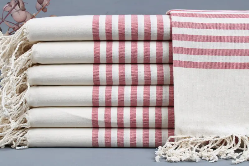 The beach towel is woven from organic Turkish cotton, ensuring durability and breathability. Each towel is handmade on looms, resulting in a consistent 40x67 inches or 100x180 centimeters size with a possible ± 2" or 5cm variance due to hand-weaving. Characterized by a weight range of 425-475 grams, these towels offer substantial absorbency.