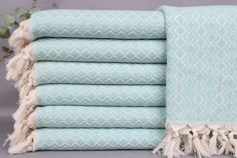 Organic Turkish cotton, woven on looms, ensures superior absorbency and durability. Each towel measures 18x36 inches or 45x90 centimeters, weighing 120 grams with a ± 2" or 5 cm tolerance due to hand-weaving. Customization includes embroidery or personalization with letters, names, or logos, which must be specified in the order note.