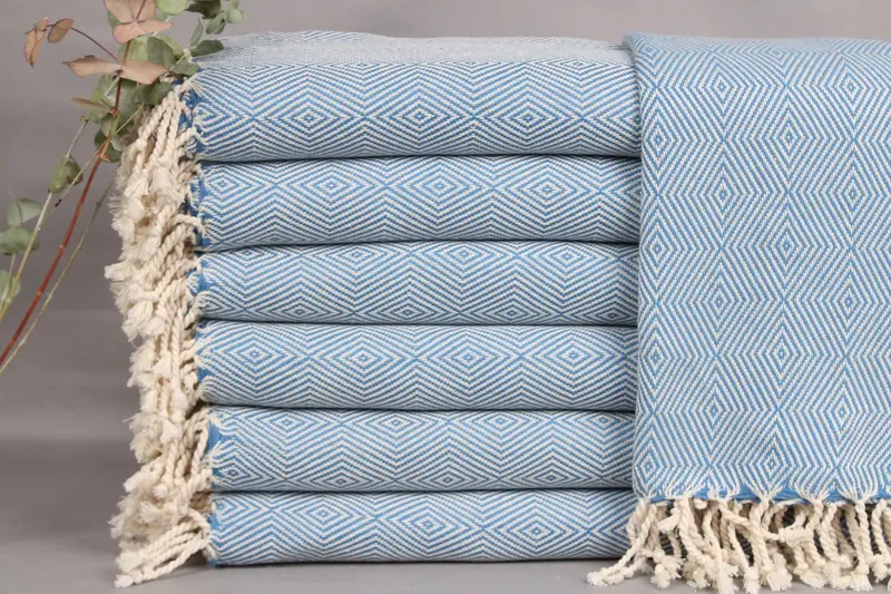 The Turkish Beach Towel is composed of organic Turkish cotton, ensuring a high level of absorbency. Each towel, blanket, or hand towel measures 40x71 inches or 100x180 centimeters, weighing 450 grams. Variations within ±2 inches or 5 centimeters are possible due to hand-weaving tolerances.