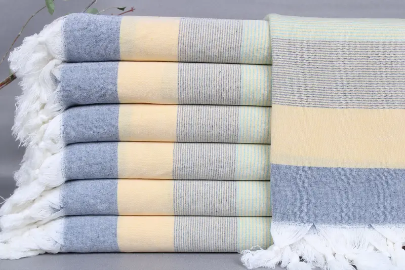Turkish Beach Towels are woven from organic Turkish cotton on looms, ensuring a natural, high-quality product. Characterized by superior absorbency, the towels are lightweight, weighing 260 grams, and measure 40x67 inches (100x170 centimeters). Hand-weaving tolerances result in size variations of up to ± 2 inches or 5 centimeters.