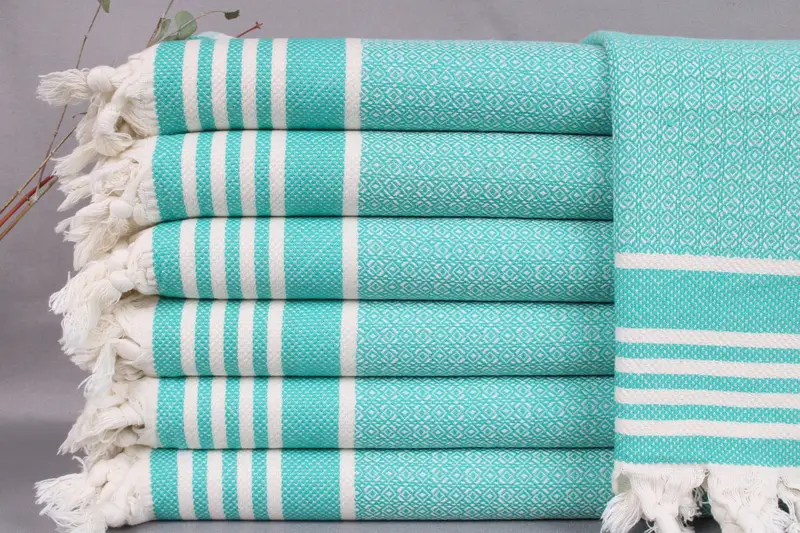 The product consists of a Turkish towel, meticulously woven from organic Turkish cotton on traditional looms, ensuring high durability and quality. Characterized by a weight of 100 grams, it measures 16x32 inches or 40x80 centimeters, with a tolerance of ± 2 inches or 5 centimeters due to the hand-weaving process. Resulting in soft and absorbent towels, they become progressively softer with each wash, especially if washed separately during the first two washes.