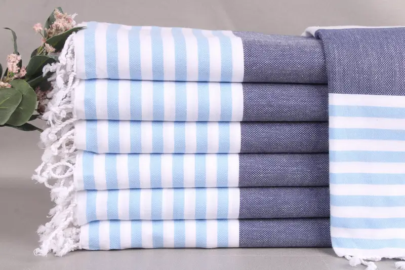 All beach towels and related items are woven from organic Turkish cotton, ensuring high absorbency and durability. Each piece measures 40x71 inches or 100x180 centimeters, with a weight of 280 grams, allowing for ±2 inches or 5 centimeters due to hand-weaving. Embroidery customization options are available with specified font, color, and placement.