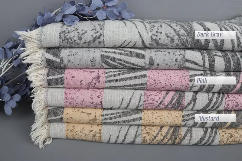 The product is characterized by its organic cotton composition, ensuring sustainability and a soft texture. Each towel is woven from organic Turkish cotton on looms, resulting in a handmade product that measures 77x38 inches or 95x195 centimeters, with a weight of 320 grams. The allowable tolerance for weaving is ± 2 inches or 5 centimeters.