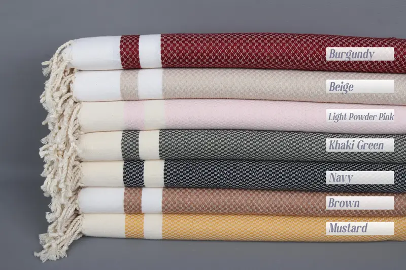 Organic Turkish cotton ensures superior absorbency and sustainability for beach towels, resulting in enhanced comfort and durability. Measuring approximately 70x40 inches or 177.8x101.6 centimeters with a tolerance of ±2 inches or 5 centimeters, these towels weigh 400 grams. Each towel is handwoven on looms, resulting in a pre-shrunk status ensuring consistent dimensions.