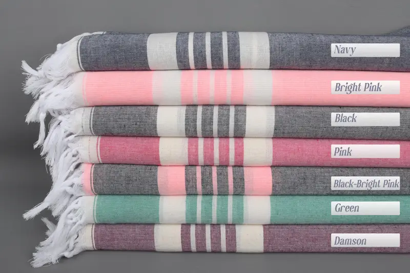Organic cotton ensures durability and sustainability, resulting in a product ideal for various applications. Each beach towel measures 70x40 inches or 180x100 centimeters, with a weight of 270 grams. The weaving process allows for a tolerance of ±2 inches or 5 centimeters.