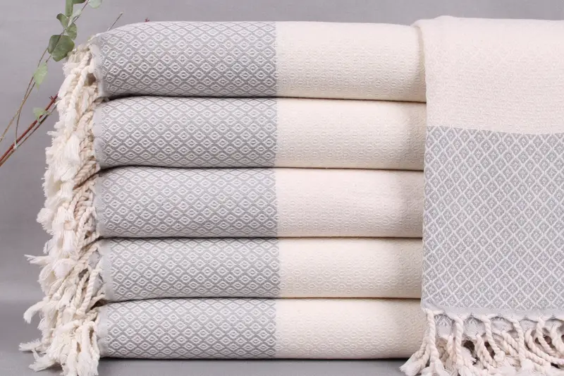 Organic Turkish cotton characterizes these beach towels, resulting in superior absorbency and durability. Each towel is meticulously hand-woven on looms, ensuring precision in dimensions and weight. Measuring 36x71 inches (90x180 cm) with a tolerance of ±2" (5 cm), each piece weighs 380 grams.