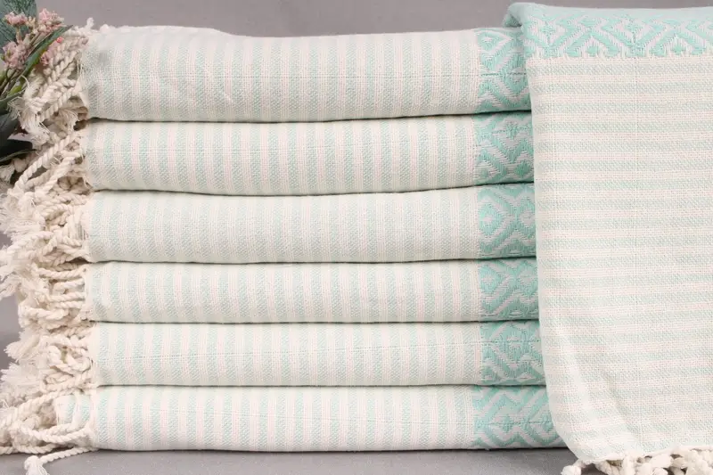 Each Turkish bath towel is woven from organic Turkish cotton, ensuring superior absorbency and durability. Characterized by dimensions of 38x75 inches (95x190 centimeters) and weighing 400 grams, these towels have a hand-weaving tolerance of ±2 inches or 5 centimeters. Hand-crafted on looms, the towels are made by skilled artisans.