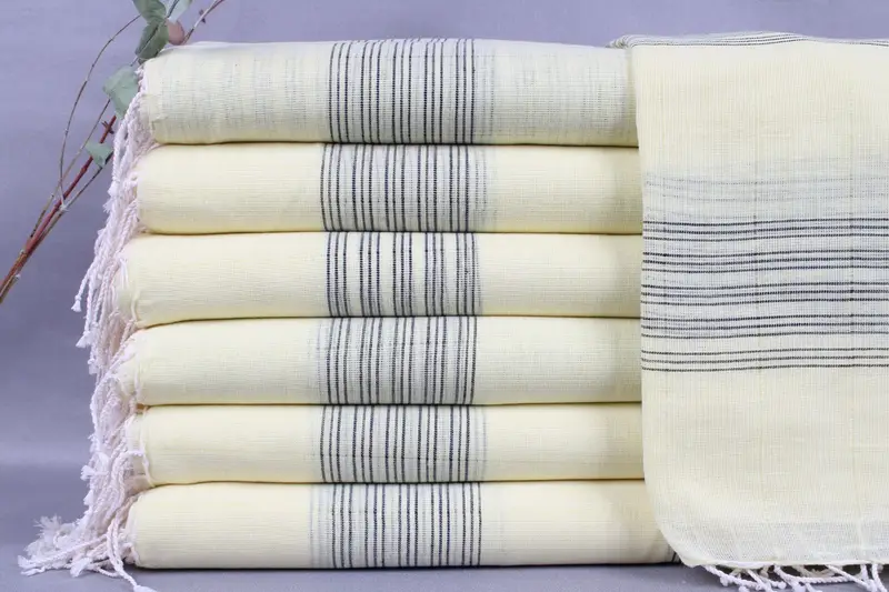 Turkish towels are woven from organic Turkish cotton, ensuring superior quality and absorbency. The towels measure 38x71 inches or 95x180 centimeters, with a weight of 160 grams. Weaving tolerances are ± 2 inches or 5 centimeters, resulting in consistent dimensions.