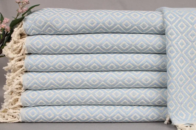 Fiber composition ensures absorbency with the Turkish towels being woven from organic Turkish cotton, resulting in a soft and durable product. All beach towels, small towels, or throws are handmade and characterized by a size of 40x71 inches or 100x180 centimeters, weighing 440 grams, with a hand-weaving tolerance of ±2 inches or 5 centimeters. Embroidery customization is available, with options for letters, names, or logos, and personalization can be noted during purchase.