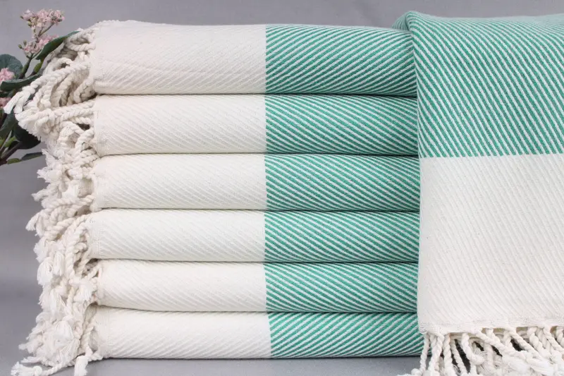 These beach towels are characterized by their fiber composition of Organic Turkish Cotton, ensuring absorbency and softness. Each towel, meticulously woven by hand on looms, measures 40x71 inches or 100x180 centimeters, weighing approximately 430 grams. The dimensions may vary by up to 2 inches or 5 centimeters due to the hand-weaving process.