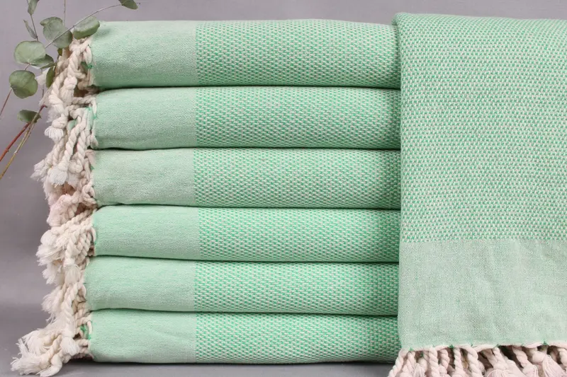 Organic Turkish cotton characterizes these towels, resulting in high absorbency and durability. Ensuring gentle care, washing is advised before first use. Each towel measures 40x71 inches or 100x180 centimeters with a weight of 390 grams, allowing ± 2 inches or 5 cm due to hand-weaving tolerance.