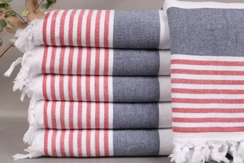 Our Turkish beach towels, hand towels, and blankets are woven from organic Turkish cotton on looms, resulting in high-quality, hand-made items. This fiber composition ensures superior absorbency and softness, which further increases with each wash.
