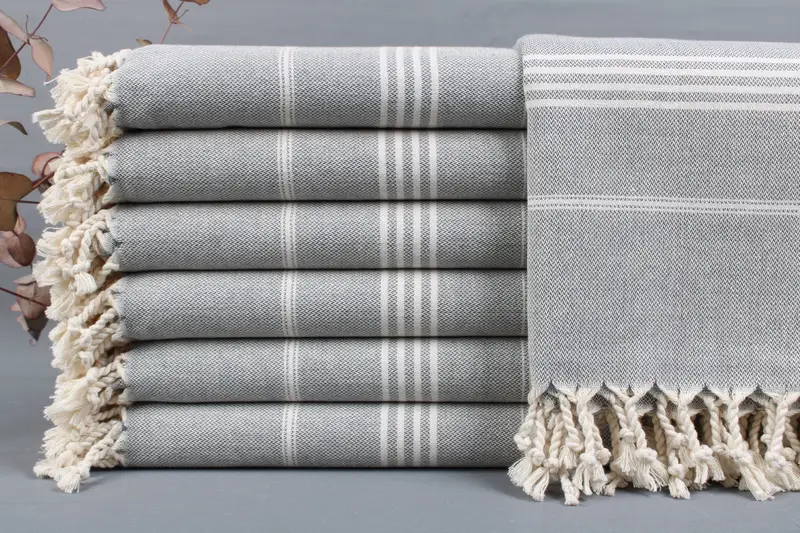 The beach towels are woven from organic Turkish cotton, ensuring superior absorbency and durability. Resulting in a lightweight yet robust fabric, these towels are characterized by their soft texture and high-quality craftsmanship. Dimensions measure 40x70 inches (100x180 cm) with a tolerance of ± 2 inches or 5 cm due to hand-weaving. Each towel weighs between 425-475 grams, providing a balanced feel and utility.