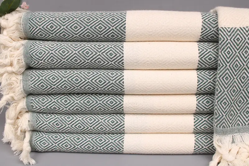 Organic Turkish cotton ensures superior absorbency and durability, resulting in plush, high-quality towels. Characterized by precise dimensions of 40x71 inches or 100x180 centimeters, the towels maintain a weight of 420 grams with a weaving tolerance of ± 2 inches or 5 centimeters. Handcrafted on looms, these towels offer personalization options including embroidered letters, names, or logos, with detailed placement instructions.