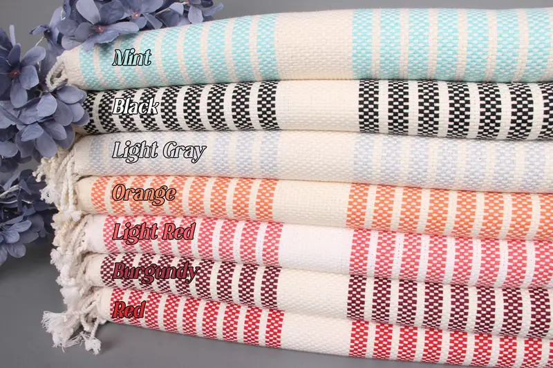 Characterized by woven organic cotton fibers, these beach towels exhibit excellent absorbency and durability. The towels, measuring 70x40 inches or 100x180 centimeters, have a weight of 450 grams, ensuring substantial thickness and comfort. Hand-woven with a tolerance of ±2 inches or 5 centimeters, each piece displays slight variations.