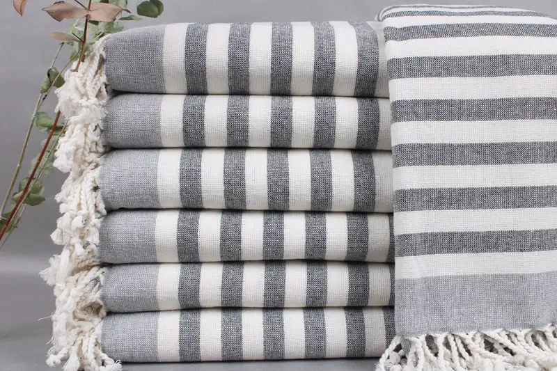 Organic Turkish cotton towels are characterized by their high absorbency and durability, ensuring quality and comfort. Dimensions are specified as 40x67 inches or 100x170 centimeters, with a weight of 422 grams. The hand-weaving process results in a tolerance of ± 2 inches or 5 cm.