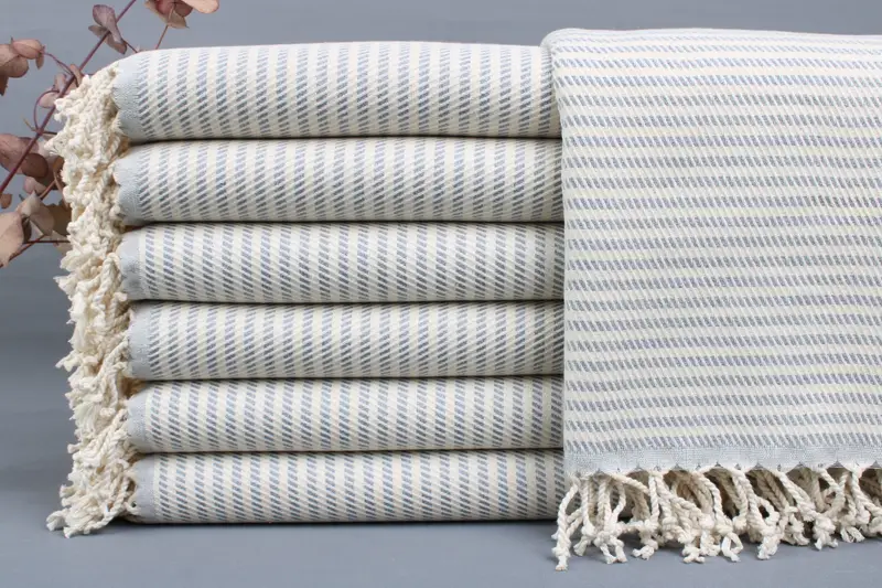 Each Turkish bath towel, hand towel, or blanket is woven from organic Turkish cotton, ensuring high quality and soft texture. Characterized by a size of 40x70 inches (100x180 cm) with a tolerance of ±2" or 5 cm due to hand-weaving. Their weight ranges between 425-475 grams, resulting in a robust and durable product.