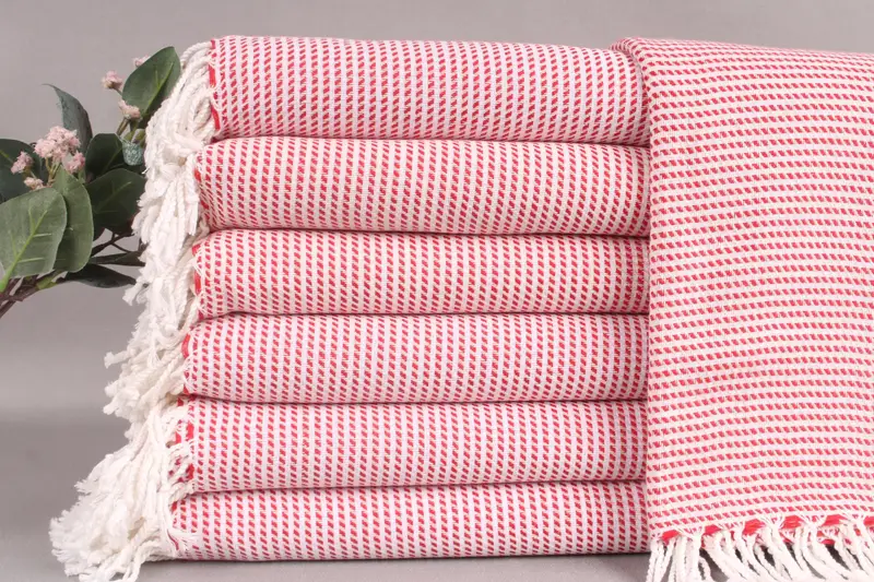 Specifications detail that these towels are meticulously hand-woven from organic Turkish cotton on looms, providing a bespoke touch. Each towel measures 40x67 inches or 100x170 centimeters, with a tolerance of ±2 inches or 5 centimeters due to the weaving process. The t...