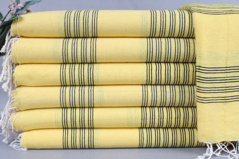 Organic Turkish cotton characterizes the towels, ensuring high absorbency and durability. These towels are meticulously hand-woven on traditional looms, resulting in a premium product. Each towel measures 38x71 inches or 95x180 centimeters, weighing approximately 160 grams, with a weaving tolerance of ± 2 inches or 5 centimeters.