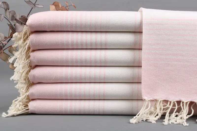 The beach towels are woven from organic Turkish cotton, characterized by exceptional absorbency and durability. Dimensions are specified as 40x70 inches or 100x180 centimeters, with a tolerance of ± 2 inches or 5 centimeters, ensuring precise size consistency. Each item weighs between 425-475 grams and is hand-woven on looms.