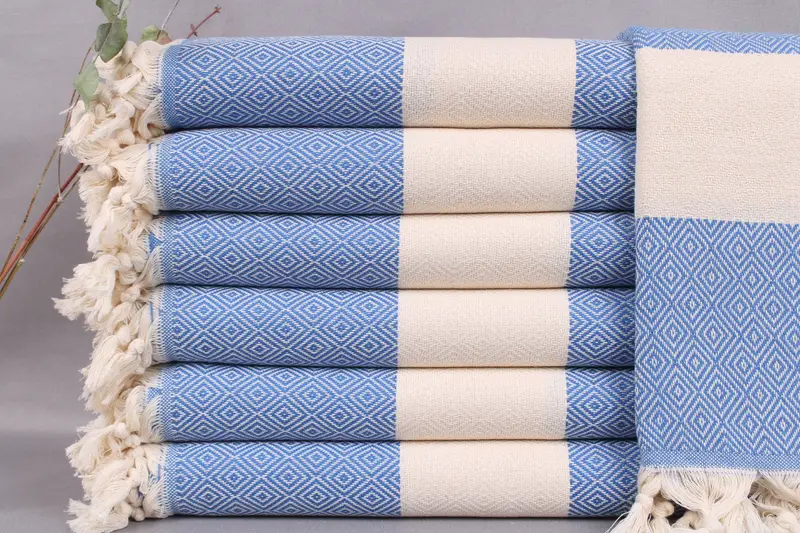 Each Turkish Beach Towel is woven from organic Turkish cotton, ensuring optimal absorbency and durability. Resulting in towels characterized by their soft texture and enhanced water retention. Dimensionally, the towels measure 40x71 inches or 100x180 centimeters, with a weight of 420 grams. The hand-weaving process allows for a tolerance of ± 2 inches or 5 centimeters.