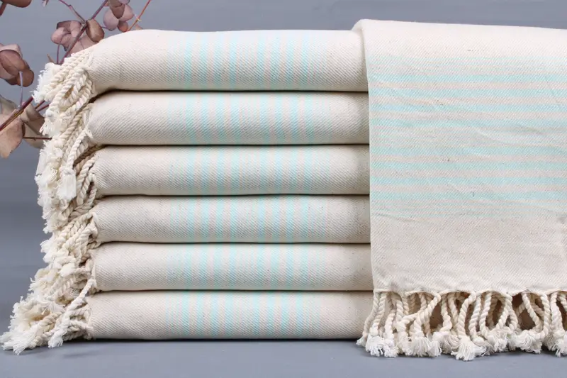 These towels are composed of organic Turkish cotton, ensuring superior absorbency. Each towel is meticulously hand-woven on traditional looms, resulting in a product that is ±2" or 5cm in variance from the standard 40x70 inches or 100x180 centimeters. The towels weigh between 425-475 grams, offering a balanced texture and durability.