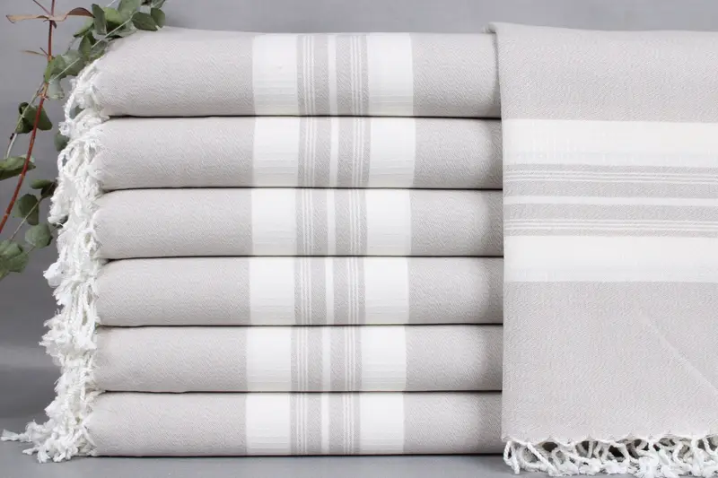 Organic Turkish cotton characterizes the fiber composition, ensuring a soft and highly absorbent towel. Resulting in towels that become softer with each wash. The Turkish beach towels feature a dimension of 38x60 inches or 95x150 centimeters, with a tolerance of ± 2" or 5 centimeters. Weighing at 250 grams, these towels are handmade using traditional looms.