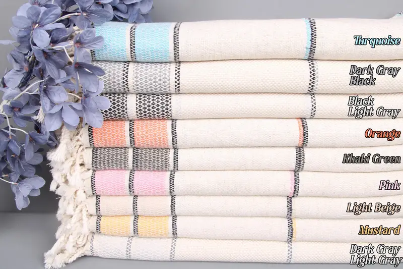 All Turkish towels are woven from organic Turkish cotton, characterized by their soft texture and excellent absorbency. Resulting in a lightweight product, each towel weighs approximately 430 grams and measures 70x36 inches (180x90 cm) with a tolerance of ± 2 inches or 5 cm. Ensuring quality, each piece is handmade on looms, thereby contributing to a unique product.
