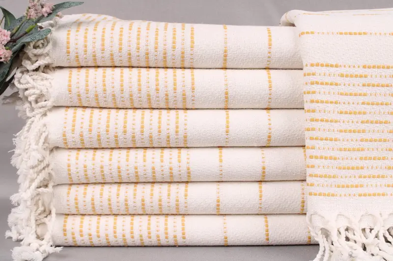 Measuring 38x71 inches or 95x180 centimeters and weighing 420 grams, these Turkish cotton towels provide a balance of size and weight. The hand-weaving process results in a tolerance of ±2 inches or 5 cm in dimensions.