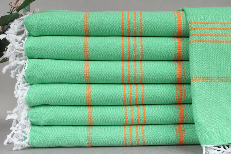 Organic Turkish cotton ensures premium quality and exceptional absorbency. The towels are intricately hand-woven on traditional looms, resulting in high-quality products. Each towel is 71x40 inches or 180x100 centimeters, weighing 265 grams with a tolerance of ±2 inches or 5 centimeters due to the weaving process.