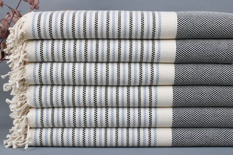 Fiber composition of these beach towels and hand towels includes organic Turkish cotton, ensuring high absorbency and durability. Size variations are 40x70 inches or 100x180 centimeters, with a tolerance of ± 2 inches or 5 centimeters, resulting in a weight range of 425-475 grams. Each piece undergoes hand-weaving, characterized by precision and artisanal quality.