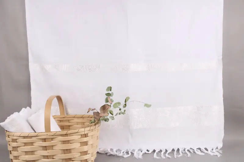 Specified by precise dimensions and weight, the towels are characterized by ±2 inches or 5 centimeters tolerance due to hand-weaving. All towels are handmade and personalized options are available with embroidery or lettering.