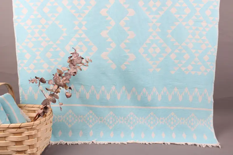The Turkish Bath Towels are woven from organic Turkish cotton, ensuring superior absorbency and durability. Each towel, blanket, or hand towel measures 40x70 inches or 100x180 centimeters, weighing between 425-475 grams. The hand-weaving process results in a tolerance of ±2 inches or 5 centimeters.