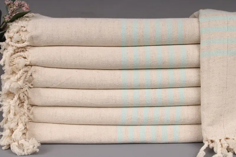 Turkish Beach Towels are composed of organic Turkish cotton fibers, ensuring superior absorbency and durability. Characterized by dimensions of 36x67 inches or 90x170 centimeters, each piece weighs approximately 250 grams. Weaving tolerances permit minor variations of ± 2 inches or 5 centimeters.