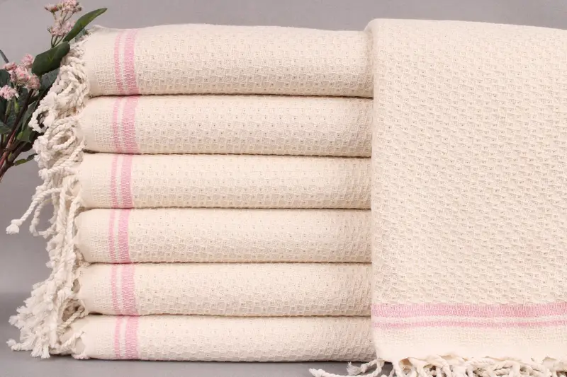 Organic Turkish cotton fiber composition ensures superior absorbency and comfort, enhancing towel performance. Characterized by dimensions of 67x36 inches (170x90 cm) and weighing 440 grams, these towels exhibit a hand-weaving tolerance of ± 2" or 5 cm. Ensuring customization potential, towels can be personalized through embroidery with specific letters, names, or logos, featuring options for font selection and color placement.