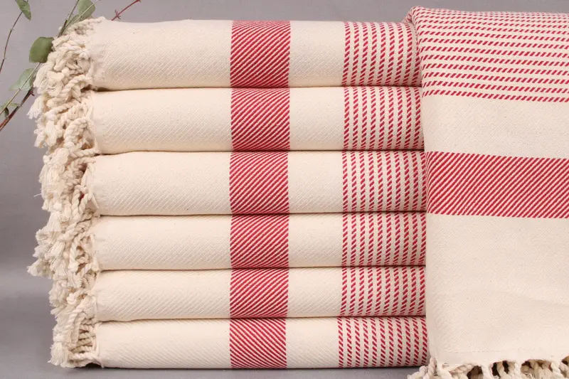 Turkish towels are characterized by their fiber composition of Organic Turkish Cotton, ensuring exceptional absorbency and softness. Resulting in towels that progressively soften with each wash, the towels typically measure 40x71 inches or 100x180 centimeters, with a tolerance of ±2 inches or 5 centimeters due to hand-weaving processes. Their weight is 400 grams, and they exhibit a balanced density suitable for diverse uses.