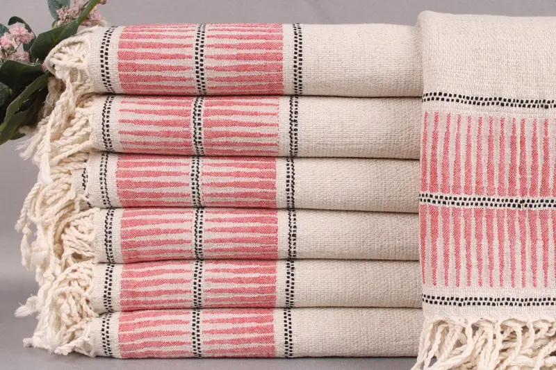 The fiber composition of the Turkish towels includes Organic Turkish Cotton, ensuring superior absorbency and comfort. Resulting from the weaving process, the towels measure 40x71 inches or 100x180 centimeters, with a weight of 340 grams. Tolerances in size are ± 2 inches or 5 centimeters due to hand-weaving.