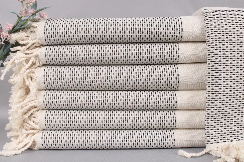 Characterized by 480 grams of organic Turkish cotton, these towels exhibit superior absorbency and soft texture. Resulting in dimensions of 40x71 inches (100x180 centimeters), the towels are handwoven with tolerances of ± 2 inches or 5 centimeters. Ensuring personalization, the towels can be embroidered with letters, names, or logos in selected fonts and colors.