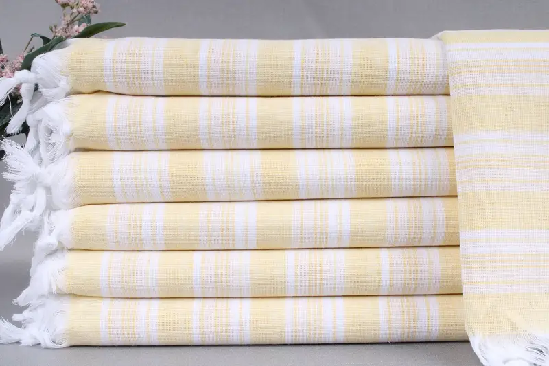 Turkish beach towels, characterized by their natural fiber composition, are woven from organic Turkish cotton, ensuring superior absorbency and comfort. Resulting in a weight of 124 grams, each towel measures precisely 40x71 inches, with a tolerance of ± 2 inches or 5 cm due to hand-weaving methods.
