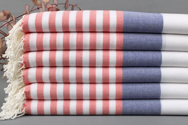 Turkish beach towels, distinguished by their organic Turkish cotton composition, are renowned for their high absorbency and soft texture, ensuring a luxurious bathing experience. Characterized by precise dimensions of 40x67 inches or 100x180 centimeters, these towels possess a weight range of 425-475 grams. The hand-weaving process allows for a tolerance of ±2 inches or 5 centimeters.
