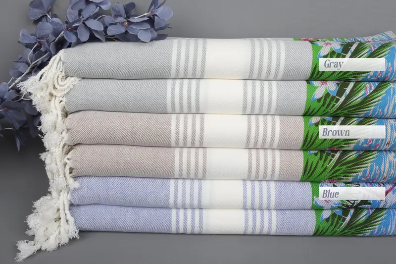 The hand-woven construction results in a towel that can be personalized with embroidery or monograms, including letters, names, or logos. Customization details must be specified, such as font type, color, and placement.