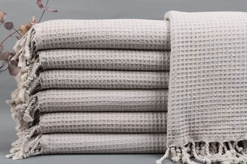 Turkish towels are produced from organic Turkish cotton, ensuring high absorbency and durability. Characterized by dimensions of 36x67 inches or 90x170 centimeters, each towel has a weight of 375-425 grams. Weaving tolerances of ± 2" or 5cm may occur, resulting in slight variations.