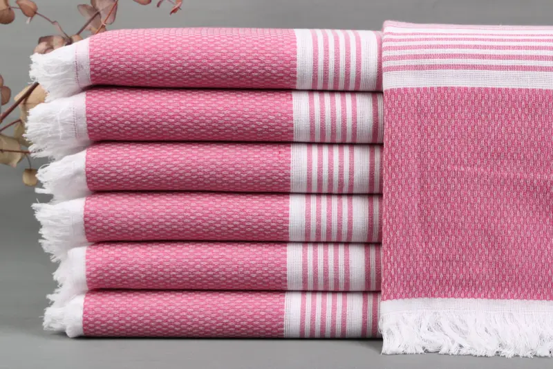 Turkish towels are woven from organic Turkish cotton, ensuring a luxurious hand-feel and high absorbency. Characterized by dimensions of 40x70 inches or 100x180 centimeters, these towels weigh between 425-475 grams, providing durability and comfort. Weaving tolerances are ± 2 inches or 5 centimeters.