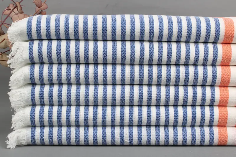 Characterized by a luxurious feel, the towels are woven from Organic Turkish Cotton, ensuring high absorbency and softness. Resulting in towels that are 40x70 inches or 100x180 centimeters, weighing between 425-475 grams, they are handmade with a ±2" or 5cm tolerance due to weaving.