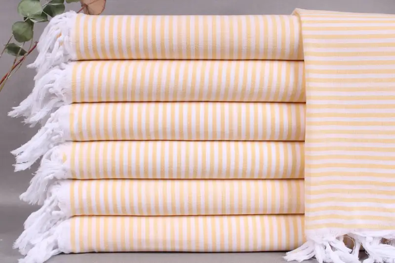 Each beach towel is woven from organic Turkish cotton, ensuring superior absorbency and a luxurious texture. Measuring 40x63 inches (100x160 centimeters) with a tolerance of ±2" or 5 centimeters, these towels weigh approximately 200 grams. Handwoven with precision, they exhibit slight variations due to the artisanal process.