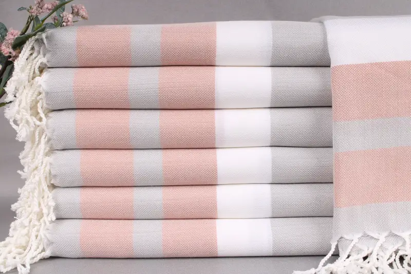 The product comprises woven organic Turkish cotton, ensuring durability and softness. Characterized by its sub-category, the beach towel features beige accents and measures 40x71 inches or 100x180 centimeters, with a weight of 280 grams. The tolerance for size is ± 2 inches or 5 centimeters due to hand-weaving.