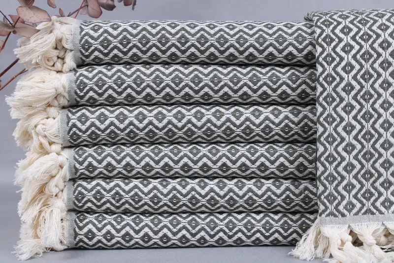 Turkish towels are characterized by their absorbency and durability, woven from organic Turkish cotton on looms. Each towel weighs approximately 400 grams, ensuring a substantial yet lightweight feel. Resulting in dimensions of 40x71 inches or 100x180 centimeters, with a tolerance of ± 2 inches or 5 centimeters due to hand-weaving.